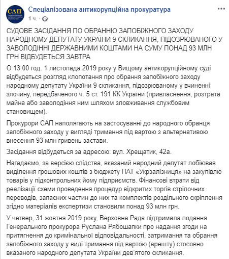 Собранные доказательства дают основания подозревать, что, будучи народным депутатом VIII созыва и находясь на посту председателя комитета Рады по вопросам транспорта, он был осведомлен о финансовом состоянии "Укрзализныцы", ее потребностях при проведении госзакупок, а также "имел влияние на учредителей и должностных лиц ПАО, которое является единственным производителем стрелочных переводов, башмакосбрасывателей, устройств уравнительных, рамных рельсов, крестовин, контррельсовых рельсов и комплектов раздельного скрепления".