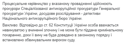 Национальное антикоррупционное бюро Украины собрало достаточно доказательств для сообщения ему о подозрении в совершении уголовных преступлений, предусмотренных ч. 5 ст. 191 УК Украины (присвоение, растрата имущества или завладение им путем злоупотребления служебным положением). По версии следствия, эти деяния повлекли убытки в размере 93 млн 277 тыс. грн.