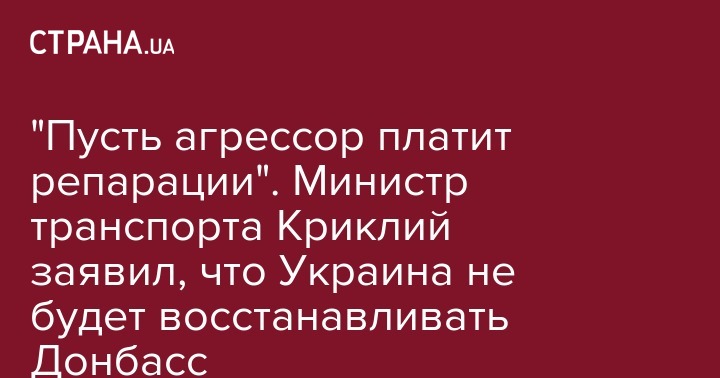 Министр транспорта и инфраструктуры Владислав Криклий заявил, что Киев не намерен за свой счет восстанавливать неподконтрольные территории Донбасса, даже если они вернутся в Украину.