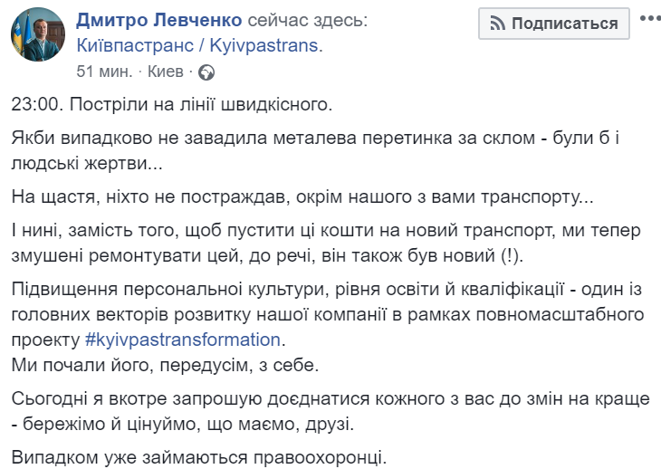 "23:00. Выстрелы на линии скоростного (трамвая - Ред.). Если бы случайно не помешала металлическая перегородка за стеклом – были бы и человеческие жертвы. К счастью, никто не пострадал, кроме нашего с вами транспорта. Случаем уже занимаются правоохранители", - говорится в опубликованном сообщении на fb-странице генерального директора "Киевпастранса" Дмитрия  Левченко.