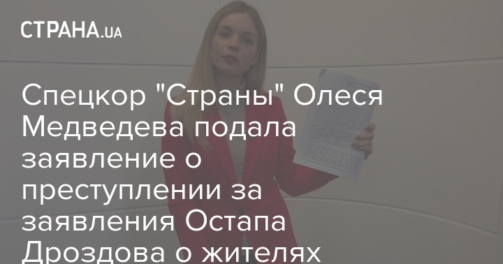 Специальный корреспондент "Страны" и блогер Олеся Медведева, как и обещала, подала заявление о совершении преступления против телеведущего Остапа Дроздова за его высказывания, унижающие жителей Донбасса.