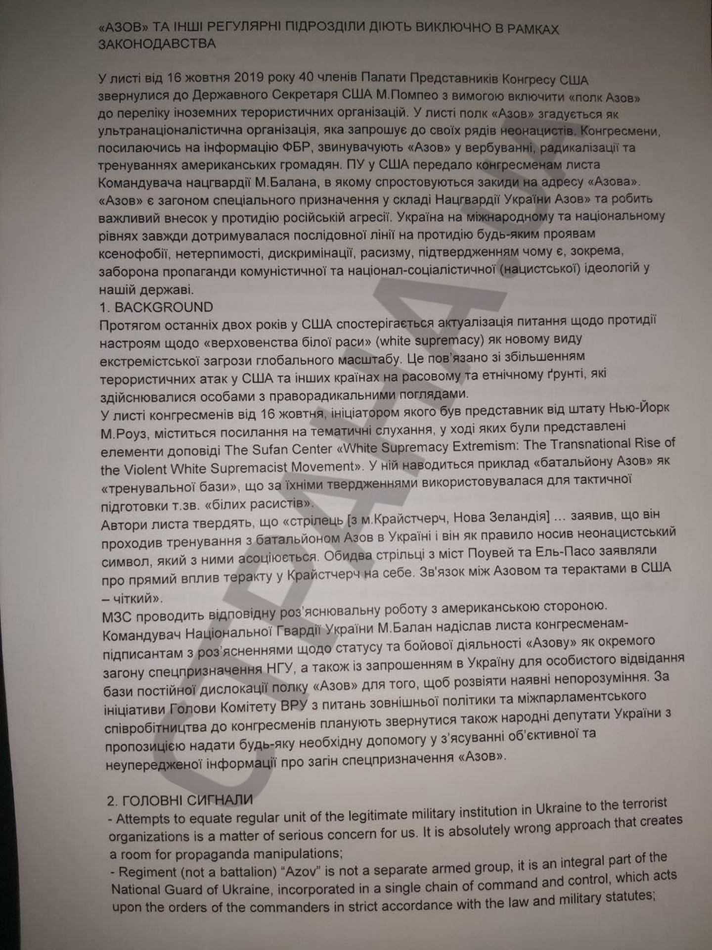 В документе излагается суть письма 40 конгрессменов, которые считают "Азов" экстремистской ультраправой организацией, вербующей боевиков по всему миру, в том числе в США. Также в обращении говорится, что примером украинского полка вдохновляются террористы по всему миру.