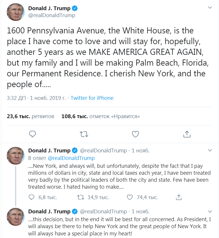 "Пенсильвания-авеню, Белый дом - это место, которое я полюбил и останусь, надеюсь, там еще на пять лет, пока мы сделаем Америку великой. Но моя семья и я сделаем Палм-Бич, штат Флорида, нашим постоянным местом жительства", - сказано в посте Трампа в соцсети.