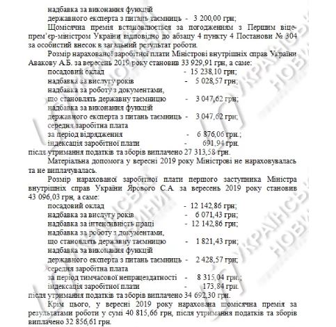 Согласно выписке Департамента коммуникаций МВД Украины, зарплата Сергея Ярового, первого зама Авакова, составила 83911 грн, заместителей Сергея Гончарова – 89655 грн, Татьяны Ковальчук – 89655 грн, Вадима Трояна – 14661 грн, государственного секретаря Алексея Тахтая – 68062 грн.