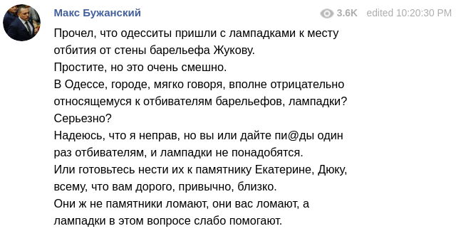 "Прочел, что одесситы пришли с лампадками к месту отбития от стены барельефа Жукову. Простите, но это очень смешно. В Одессе, городе, мягко говоря, вполне отрицательно относящемуся к отбивателям барельефов, лампадки? Серьезно? Надеюсь, что я неправ, но вы или дайте пи@ды один раз отбивателям, и лампадки не понадобятся. Или готовьтесь нести их к памятнику Екатерине, Дюку, всему, что вам дорого, привычно, близко. Они ж не памятники ломают, они вас ломают, а лампадки в этом вопросе слабо помогают", - написал Бужанский.