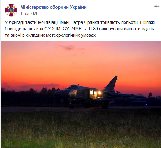 "В бригаде тактической авиации имени Петра Франко продолжаются полеты. Экипажи бригады на самолетах СУ-24М, СУ-24МР и Л-39 выполняли вылеты днем и ночью в сложных метеорологических условиях", - уточнили в пресс-службы Министерства обороны.