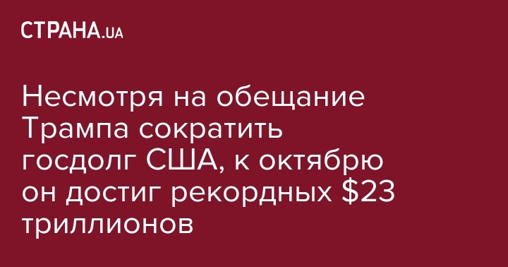По состоянию на 31 октября 2019 года государственный долг США превысил рекордный показатель в 23 триллиона долларов. Об этом сообщает сайт Фонда Пита Петерсона со ссылкой на данные Минфина США.