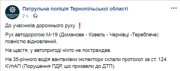 "К участникам дорожного движения! Движение по автодороге М-19 (Доманово - Ковель - Черновцы - Тереблече) полностью восстановлено", - сказано в записи в соцсети.