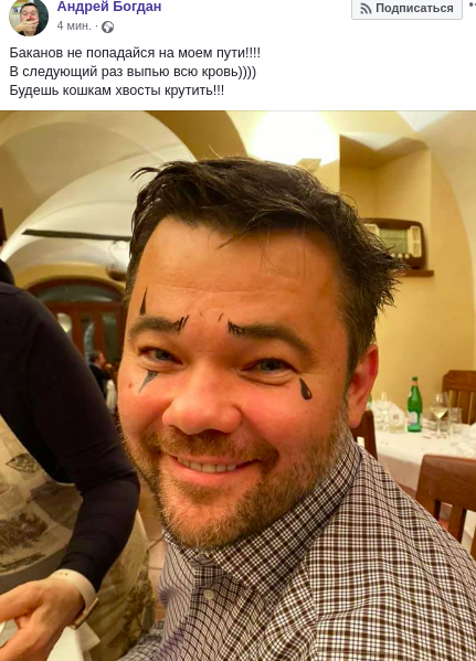 "Баканов не попадайся на моем пути!!!! В следующий раз выпью всю кровь)))) Будешь кошкам хвосты крутить!!!" – написал глава Офиса президента.