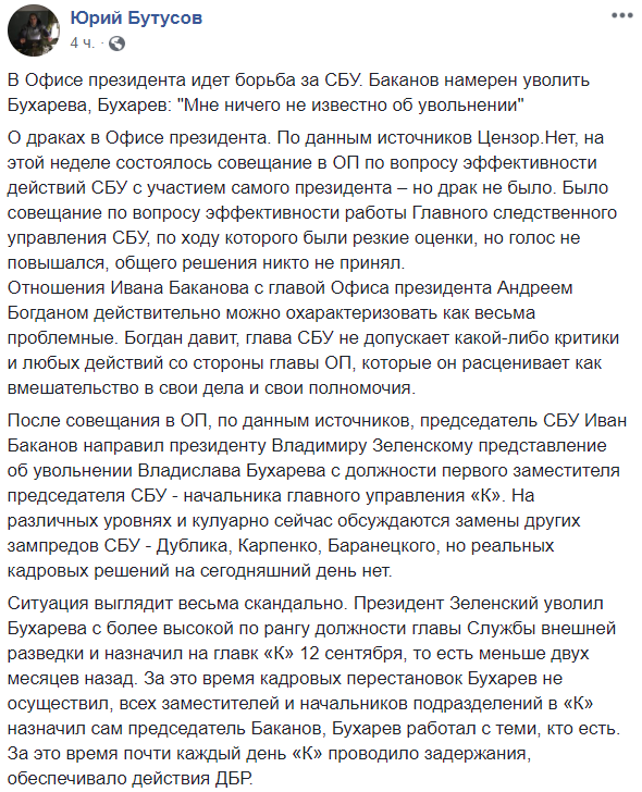 Ситуация выглядит весьма скандально. Президент Зеленский уволил Бухарева с более высокой по рангу должности главы Службы внешней разведки и назначил на главк "К" 12 сентября, то есть меньше двух месяцев назад. За это время кадровых перестановок Бухарев не осуществил, всех заместителей и начальников подразделений в "К" назначил сам председатель Баканов, Бухарев работал с теми, кто есть. За это время почти каждый день "К" проводило задержания, обеспечивало действия ДБР".