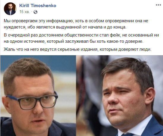 В очередной раз достоянием общественности стал фейк, не основанный ни на одном источнике, который заслуживал бы хоть какое-то доверие. Жаль, что на него ведутся серьезные издания, которым доверяют люди", – написал в Facebook замглавы ОП Кирилл Тимошенко.