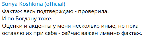 "Фактаж весь подтверждаю – проверила. И по Богдану тоже. Оценки у меня несколько иные, но сейчас важен именно фактаж", – написала она.