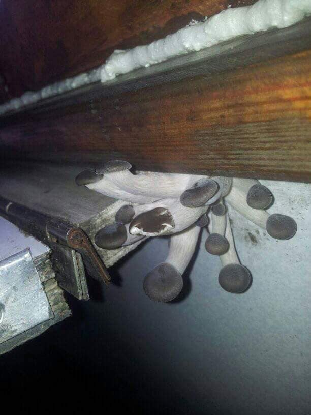 На фото видно, как прямо в вагоне из-под небрежно залепленной монтажной пеной оконной рамы выросли грибы, прямо возле стола.