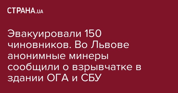 "Информация о заминировании Львовской областной государственной администрации и СБУ поступила 5 ноября на электронную почту полиции... Взрывоопасных или подозрительных предметов не обнаружено. "Правоохранители осмотрели помещения и прилегающие территории. Из здания ЛОГА были эвакуированы 150 человек", - отмечается в сообщении.