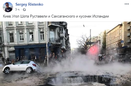 Центр Киева сравнивают с Исландией, знаменитой своими гейзерами. "Киев. Угол Шота Руставели и Саксаганского и кусочек Исландии", – комментирует Сергей Ристенко.