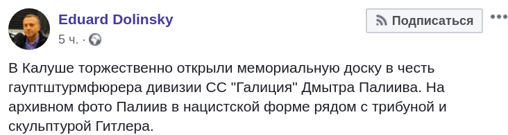 "В Калуше торжественно открыли мемориальную доску в честь гауптштурмфюрера дивизии СС Галиция Дмытра Палиива", - написал Долинский.