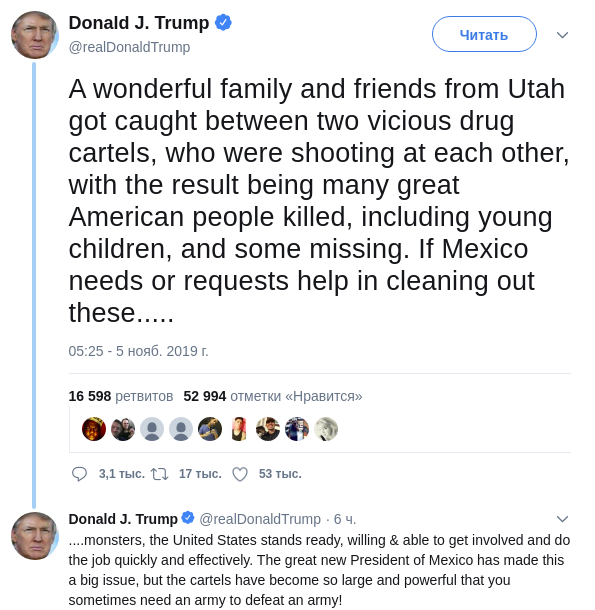 "Если Мексика нуждается или просит помощи в устранении этих монстров, Соединенные Штаты готовы и могут принять участие и выполнить работу быстро и эффективно. Великий новый президент Мексики сделал это большой проблемой, но картели стали настолько большими и могущественными, что иногда вам нужна армия, чтобы победить армию" - написал президент.