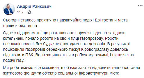 "Сегодня произошло практически чрезвычайное событие! Две трети города остаются без тепла. Одно из предприятий, которое расположено рядом с юго-западной котельной, начало работы на своей ветке газопровода", - написал Райкович.