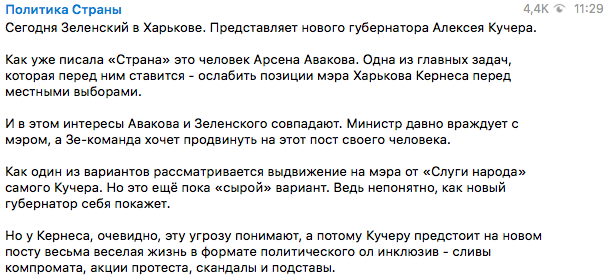 "Одна из главных задач, которая перед ним ставится - ослабить позиции мэра Харькова Кернеса перед местными выборами. И в этом интересы Авакова и Зеленского совпадают. Министр давно враждует с мэром, а Зе-команда хочет продвинуть на этот пост своего человека.