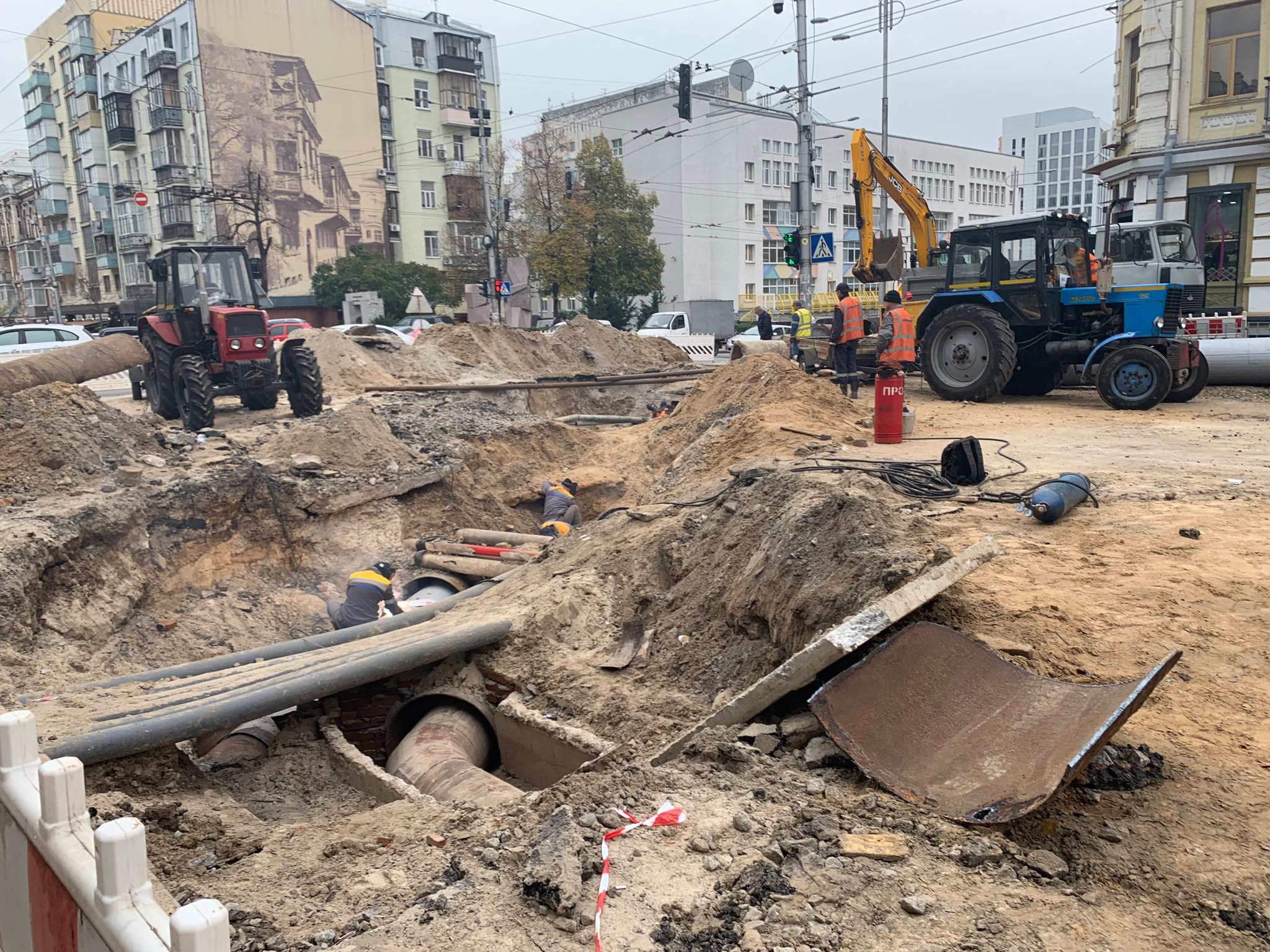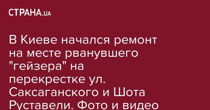 В Киеве на месте "гейзера" от прорыва трубы на перекрестке улиц Саксаганского и Шота Руставели начался ремонт. Задействована коммунальная техника.