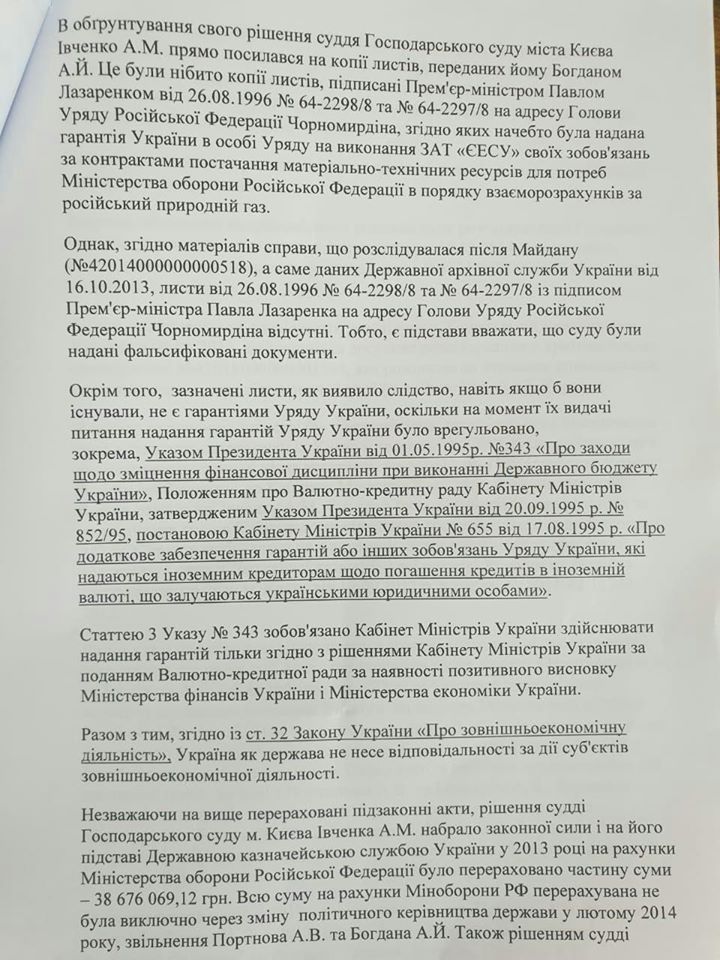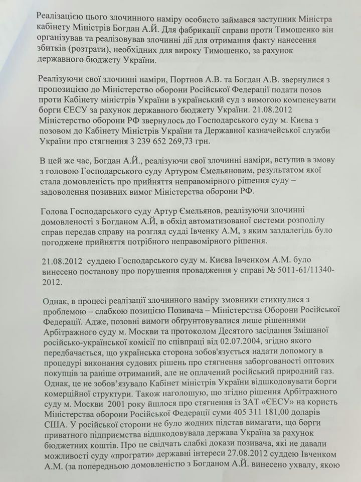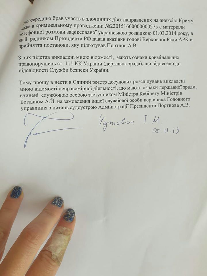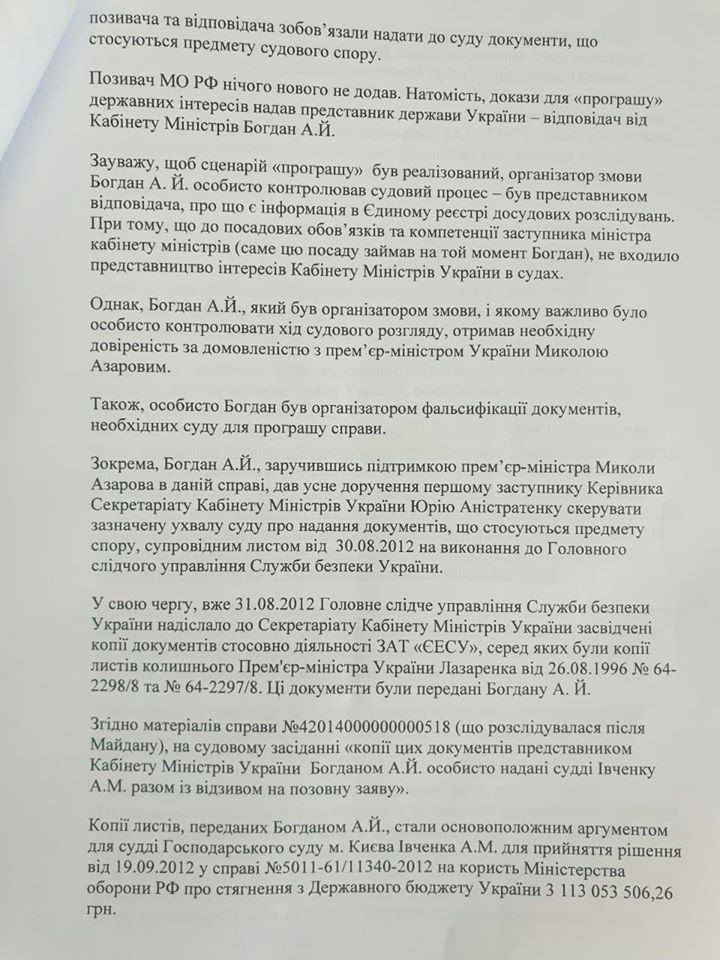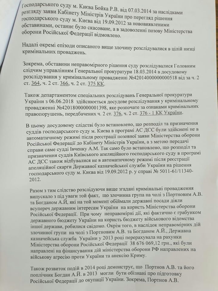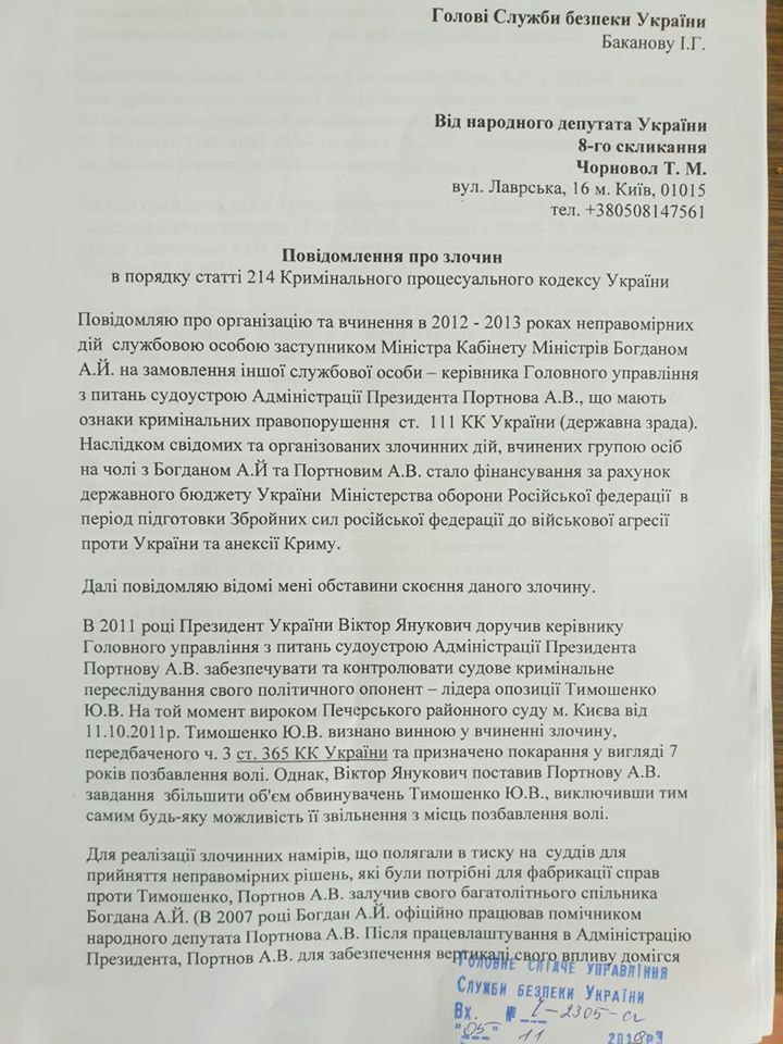 "Измена Украины заключается в том, что Андрей Богдан, будучи должностным лицом КМУ в период 2010-2014 годов, организовал растрату средств государственного бюджета в размере 3 млрд грн в интересах Министерства обороны РФ. Причем следствием преступления Богдана стало финансирование из бюджета Украины вооруженных сил врага в период его подготовки к нападению на Украину, оккупации и аннексии Крыма (ведь 36 млн грн на счета МО РФ были перечислены в 2013 году). Это как раз подследственность СБУ ", - сообщила Чорновол и прикрепила скрины заявления на 7 страницах.