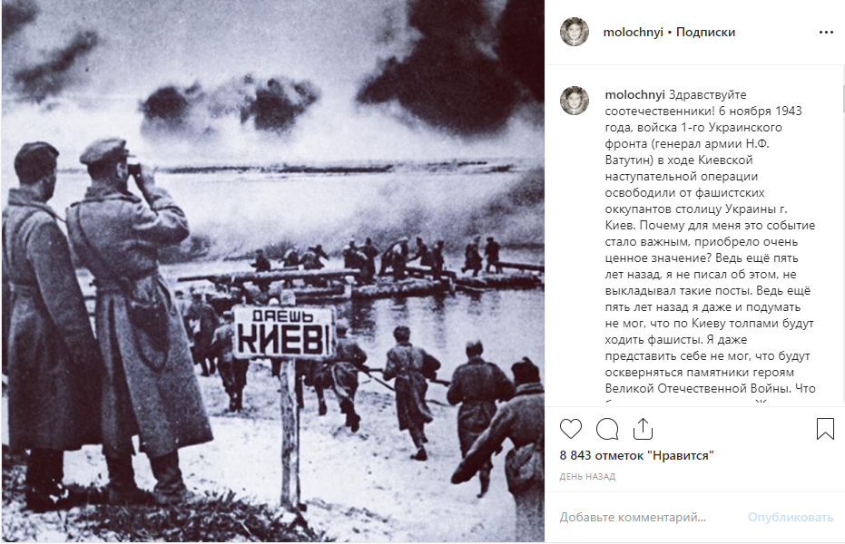 Ничего у вас гады не получится. Теперь за эту память я зубами держаться буду. Буду держаться по многим причинам, и ещё потому, что в составе 1-го Украинского фронта, под командованием Николая Фёдоровича Ватутина и Георгия Константиновича Жукова, прошёл всю войну и погиб в апреле сорок пятого года мой прадед Пётр Андреевич Молочный. И это моя ценность. Буду помнить и чтить я, значит будут помнить и чтить мои дети, а значит великий подвиг и победа нашего народа, наших предков - бессмертны. С праздником! Ура!", - написал актер.