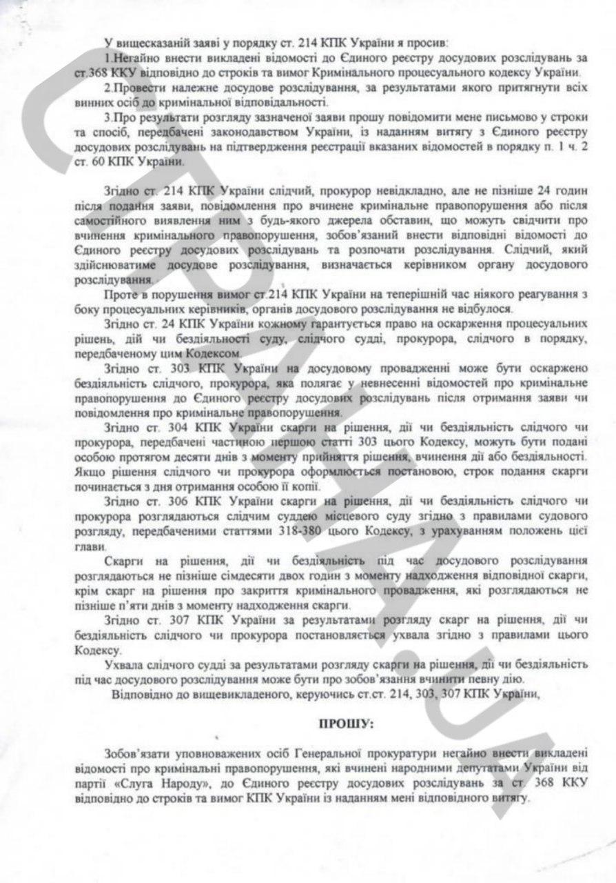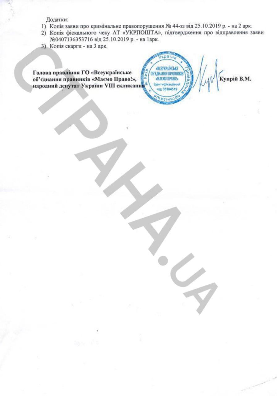 "Таким образом с 30 октября начался срок бездеятельности генпрокурора, который длится 10 дней. Я ждал почту до последнего, но письма о регистрации преступления так и не пришло. Поэтому сегодня я направил две жалобы: первая - в Антикоррупционный суд о бездеятельности НАБУ, вторая - в Печерский суд касательно бездеятельности генпрокурора Рябошапки, которую должны рассмотреть на протяжении 72 часов. Суд должен обязать начать расследование. Очевидно, что руководство правоохранительных органов хочет замять этот скандал. Возможно по указанию президента Зеленского или главы ОП Богдана, так как именно он руководит этим направлением, а Зеленский прислушивается. Никто не желает, чтобы эти коррупционные схемы были остановлены. И для меня это показательно. Буду добиваться, чтобы все, кто указан в материалах были допрошены, а виновные получили наказание", - сказал Куприй.