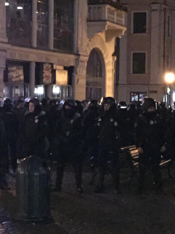 "На площади Рынок Львов снова драка фанатов возле "Правды". Полиция присутствует, заведение в цепи полиции и спецбатальона ТОР. На 18:15 полиция присутствует, фаны только перекликаются. Много разбитого стекла под ногами", – пишет Зинкевич.