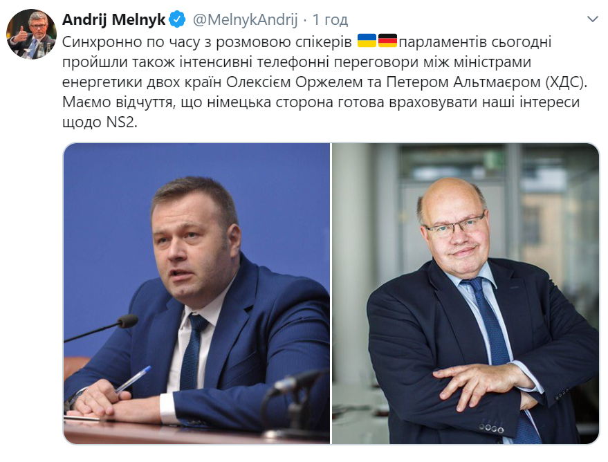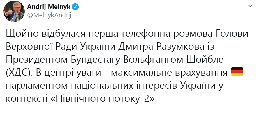 В другом сообщении говорится о телефонных переговорах по Северному потоку-2, которые, параллельно разговору Разумкова и Шойбле, провели министры энергетики Украины и Германии.