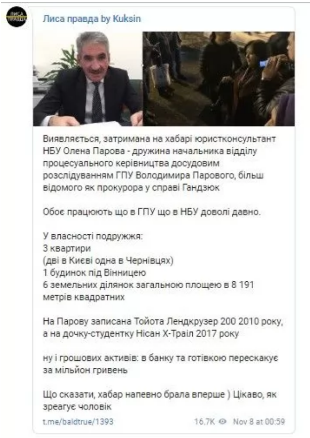 Паровой известен тем, что занимается делом об убийстве херсонской активистки Екатерины Гандзюк. По словам авторов поста в Telegram, и Паровой в ГПУ, и его супруга в НБУ работают довольно давно.