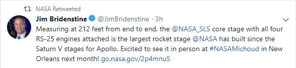 "Первая ступень ракеты SLS высотой 212 футов (65 метров - Ред.) со всеми четырьмя подсоединенными двигателями RS-25 является самой большой с тех пор, как НАСА построила носитель Saturn V для корабля "Аполлон" (для предыдущих пилотируемых полетов к Луне - Ред.), - написал Брайденстайн.