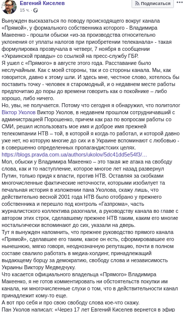 Уколов заявил, что обыски у Владимира Макеенко - это такая же атака на свободу слова, как наступление Путина на НТВ по приходу к власти. Киселев в ответ на это отметил, что прежнее руководство канала "Прямой", сформировавшее его нынешнюю неоднозначную репутацию, почти в полном составе ушло работать в медиа-холдинг, принадлежащий Виктору Медведчуку.