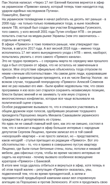 "Сегодня я обнаружил, что политолог Виктор Уколов, в недавнем прошлом сотрудничавший с администрацией Порошенко, причем как раз по вопросам работы со СМИ, решил использовать мое имя и доброе имя прежней телекомпании НТВ - той, в которой я когда-то работал... в совершенно определенных пропагандистских целях".
