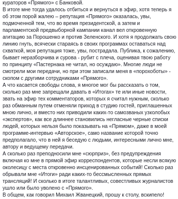 В частности, он поведал, что во время его работы на телеканале "Прямой" ему много раз запрещали давать те или иные новости, звать на эфир тех комментаторов, которых он считал нужным, обманным путем отменяли приход в студию гостей, приглашенных Киселевым, что "все длиннее становились негласные черные списки людей, которых нельзя было показывать на "Прямом", даже в моей программе-интервью "Авторское", само название которой точно предполагало, что в ней я беседую с людьми, интересными лично мне, автору и ведущему передачи".