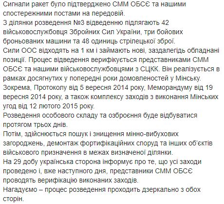 12:20 – практическое разведение сил и средств начато. Сигналы ракет были подтверждены СММ ОБСЕ и нашими наблюдательными постами на передовой", – говорится в сообщении пресс-центра ООС.