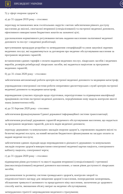 - До 31 марта 2020 года президент приказал обеспечить функционирование Единой государственной информационной системы трансплантации, обеспечить реализацию государственных гарантий медицинского обслуживания населения, перевести государственные и коммунальные учреждения здравоохранения на новый механизм бюджетного финансирования на основе оплаты за предоставленные медицинские услуги, внедрить электронные мед карты, электронный кабинет пациента, электронную очередь.