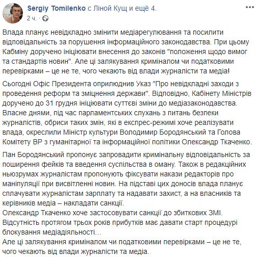 "Но эти запугивания криминалом или налоговыми проверками - это не то, чего ждут от власти журналисты и медиа. Защита прав журналистов (реальная борьба с безнаказанностью) и защита рабочих мест (экономические стимулы для развития украинских СМИ). Вот очевидные приоритеты информационной политики для нового правительства, а не уголовная ответственность для медийщиков" - написал Томиленко.
