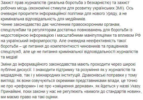 "Изменения к информационному законодательства должны проходить через широкие публичные дискуссии. И находить поддержку и понимание как у журналистов и медиадеятелей, так и у международных институтов. Драконовские поправки в том виде, как они озвучиваются отдельными представителями власти, это точно не о "реформах" и не об "укреплении государства", как говорится в названии Указа. По крайней мере, пока законы у нас не регулируют "требования к стандартам новостей", мы имеем право на такие оценки" - подытожил глава НСЖУ.