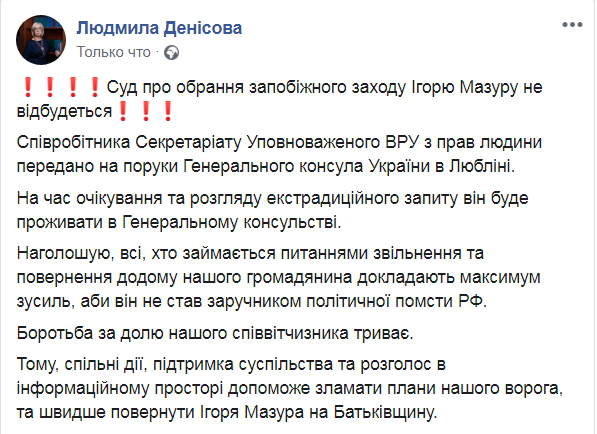 По сообщению омбудсмена, Мазура, который является сотрудником секретариата уполномоченного ВРУ по правам человека, передали на поруки генерального консула Украины в Люблине. В период ожидания и рассмотрения экстрадиционного запроса Мазур будет проживать в генеральном консульстве.