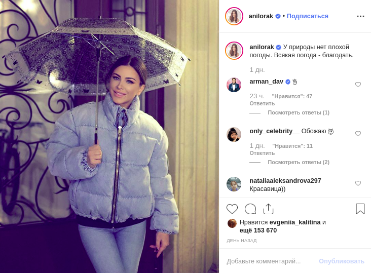 "У природы нет плохой погоды. Всякая погода - благодать", - подписала Ани Лорак снимок, на котором она стоит в теплой куртке и джинсах под зонтом. На лице певицы легкий макияж.