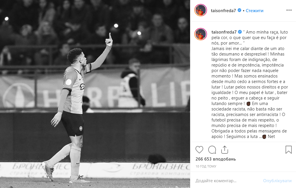 Капитан донецкого Шахтера Тайсон, оказавшийся в центре расистского скандала на стадионе во время матча 14-го тура украинской Премьер-лиги с киевским Динамо (1:0), выступил с заявлением.