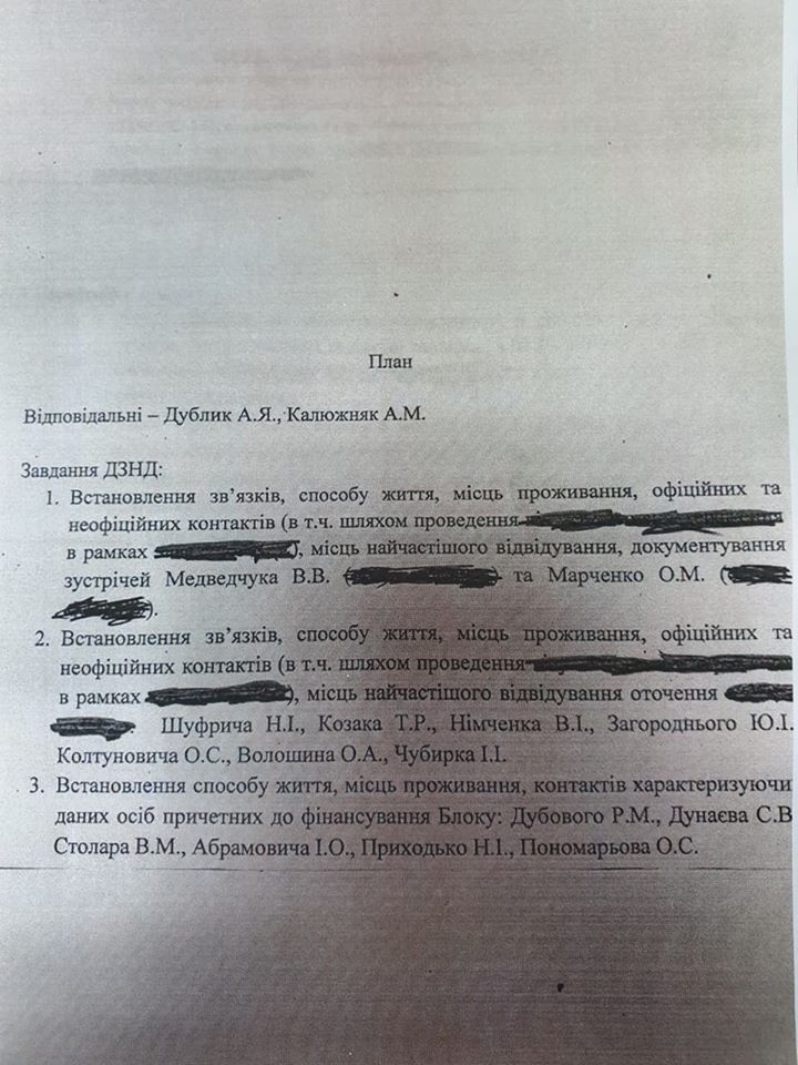 Согласно документу, Департамент защиты национальной государственности СБУ получил задание установить связи, места проживания, официальные и неофициальные контакты Виктора Медведчука, а также его жены Оксаны Марченко, нардепов Шуфрича, Козака, Нимченко, Загороднего, Колтуночива, Волошина, Чубирка и других.