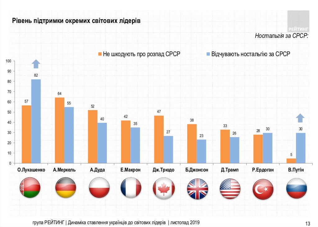 Среди наиболее обеспеченных украинцев симпатии в первой тройке распределились между Ангелой Меркель, Алксандром Лукашенко и Анджеем Дудой. Четвертое место с результатом выше 50% занимает канадский премьер Джастин Трюдо.