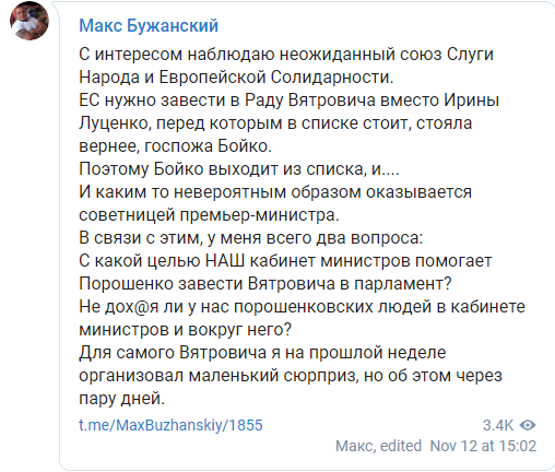 Ранее Бужанский прокомментировал возможное возвращение Вятровича в соцсетях.