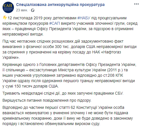 Светлану Кондзелю подозревают в коррупции и взяточничестве. В САП сообщили, что во время негласных следственных действий был задокументирован факт вымогательства. С физического лица требовали 300 тыс. долларов за назначение на пост заместителя председателя правления НАК "Нафтогаз Украины".