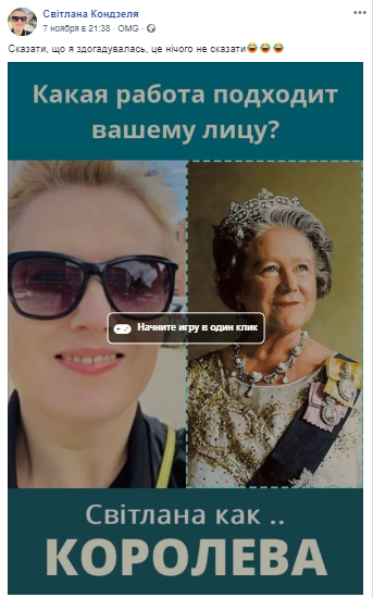 Страница Светланы Кондзели в Facebook, несмотря на то, что она в Администрации президента уже 10 лет, совсем не похожа на страницу чиновницы. Она наполнена селфи, фотографиями природы, результатами тестов в духе "Какая работа подходит вашему лицу".
