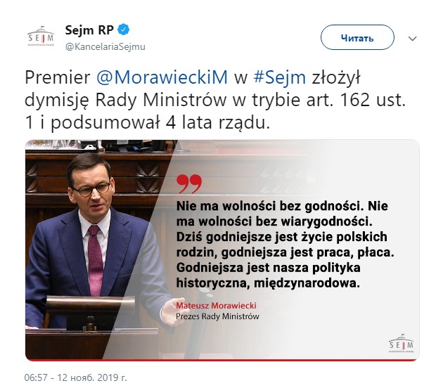 Как отмечается, согласно конституции Польши, Моравецкий подал прошение об отставке во время первого заседания нижней палаты парламента. Премьер-министр также подвел итоги четырех лет деятельности кабмина, отметив, что работа правительства способствовала повышению благополучия населения, увеличению расходов на здравоохранение и мер по поддержке молодежи.