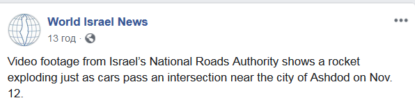 "Видеозапись, представленная Национальным управлением автомобильных дорог Израиля, показывает, как взрывается ракета, когда машины проезжают перекресток около города Ашдод 12 ноября", - пояснили журналисты.