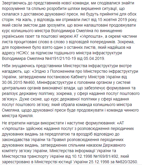Обращаясь к представителям новой команды, мы надеялись найти понимание и совместно разработать пути решения сложившейся ситуации с доставкой печатной прессы, которые будут приемлемы для обеих сторон. К сожалению, в ответ мы получили письмо от 15 октября 2019 года, которое своим содержанием дало понять, что они настроены продолжать курс бывшего министра Владимира Омеляна по уничтожению украинских газет и почтовой сети АО "Укрпочта", а отдельные части письма были процитированы слово в слово из ответов предшественников. В частности, для сравнения было взято одно из последних писем, которое поступилу в адрес НСЖУ за подписью тогдашнего министра инфраструктуры Владимира Омеляна №4191/21/10-19 от 05.04.2019.