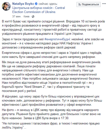 Свое решение Наталья Бойко объяснила тем, что в течение 10 последних лет она профессионально "развивалась в энергетической сфере - от первого шага в юриспруденции, консалтинге и проектной работе в частном секторе до осознанного решения работать в Украине и для Украины".